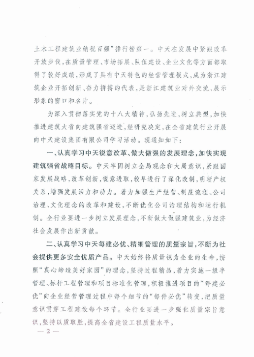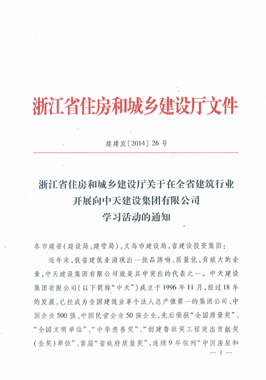 《浙江省住房和城乡建设厅关于在全省建筑行业开展向918博天堂建设集团有限公司学习活动的通知》